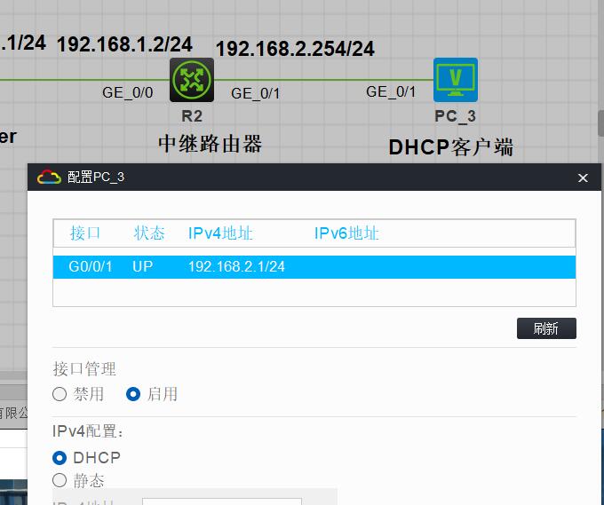 在R1上创建的地址池必须要宣告192.168.2.0/24网段。DHCP分配的网关地址应该是192.168.2.0/24网段的真实网关,根据拓扑得知,网关就是R2的g0/1接口,IP地址为192.168.2.254