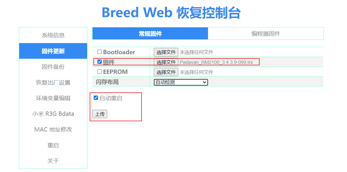 4. 点击“固件更新”,在Bootloader处选择电脑上的bootloader-redmi-ac2100.bin,点击上传,然后点更新,然后点击重启;