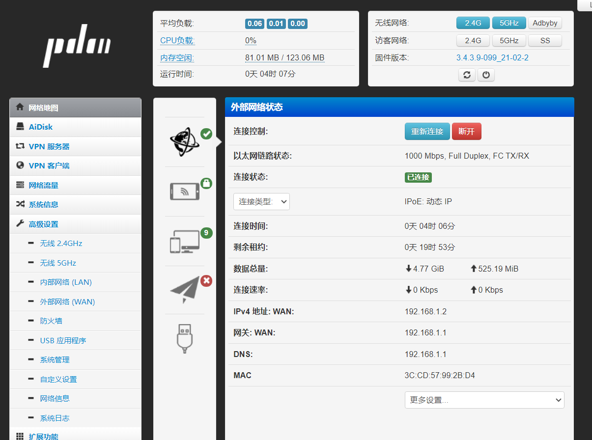 等待称其进入路由器后台http://192.168.123.1 默认用户名:admin,默认密码:admin;如下为主界面