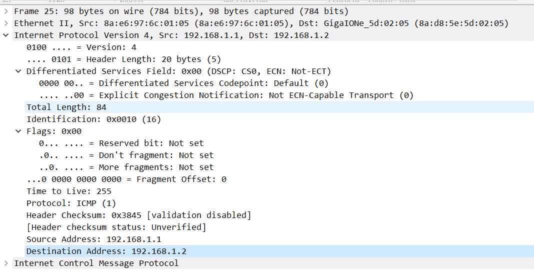 步骤3:双击某个Ping包,查看数据包详细内容,展开Internet Protocol Version 4,可以查看到详细的IP头部格式,如图所示