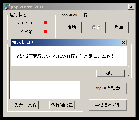 步骤2:解压完成,PHPStudy会自动运行,如出现图1-2所示报错,则需安装VC11、VC14运行库,运行库安装略