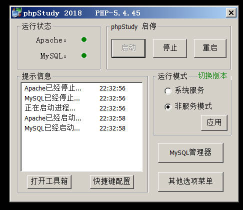 步骤3:点击启动按钮,直到显示Apache和MySQL都已经启动,则PHPStudy安装成功,如图1-3