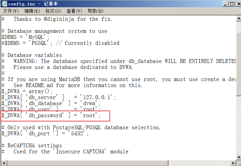 步骤6:用记事本打开 config.inc.php 文件,把配置文档中的 $_DVWA[ 'db_password' ] = 'P@ssw0rd'; 修改为 $_DVWA[ 'db_password' ] = 'root';,如图 1-6(这里修改的是 MySQL 的管理员密码,该密码默认是 root,如果修改过 MySQL 密码,这里需要改成你自己的密码)