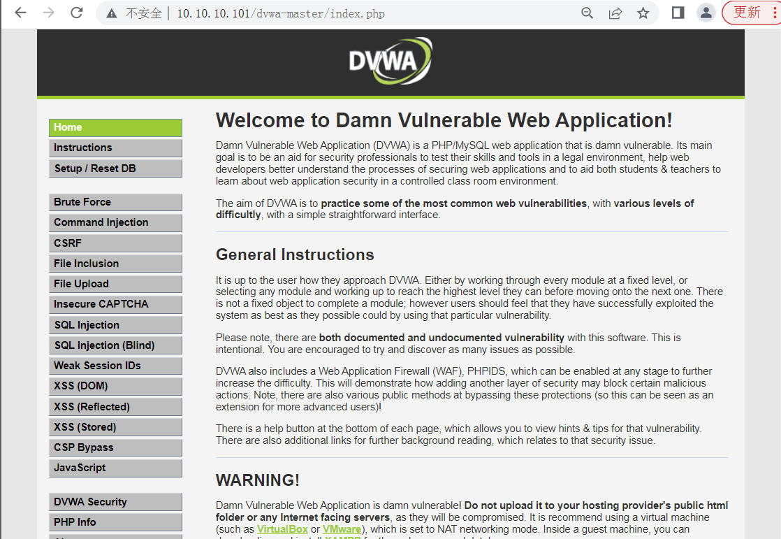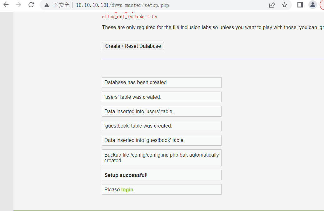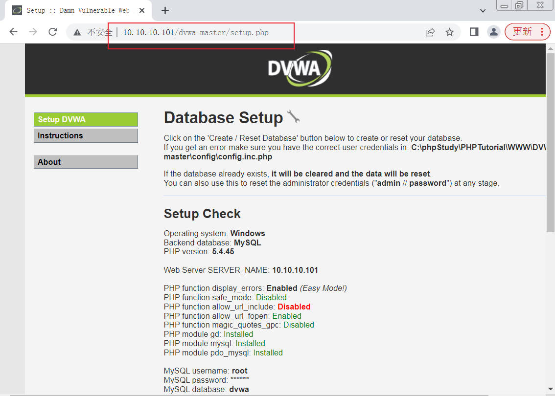 步骤 7:使用浏览器访问站点安装页面,URL 使用本机 IP 地址即可,这里靶机的 IP 地址为 10.10.10.101,安装页面地址就为 http://10.10.10.101/dvwa-master/setup.php,如图 1-7