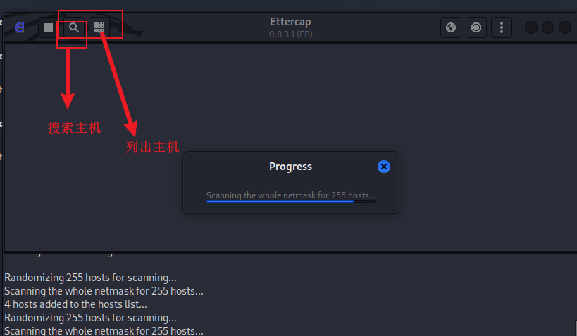 注:使用Ettercap对内网进行扫描以获取主机IP和网关信息