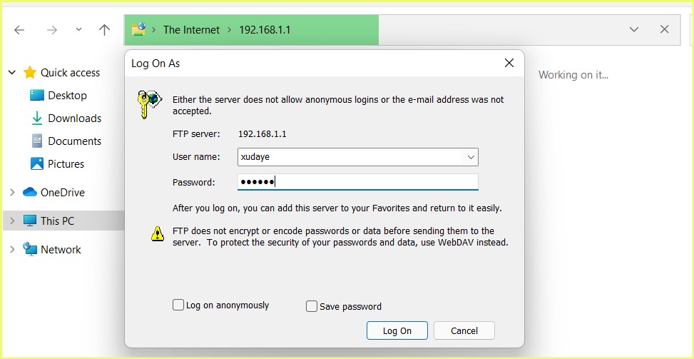 步骤1:使用资源管理器访问FTP服务,输入用户名和密码,如图1-2所示